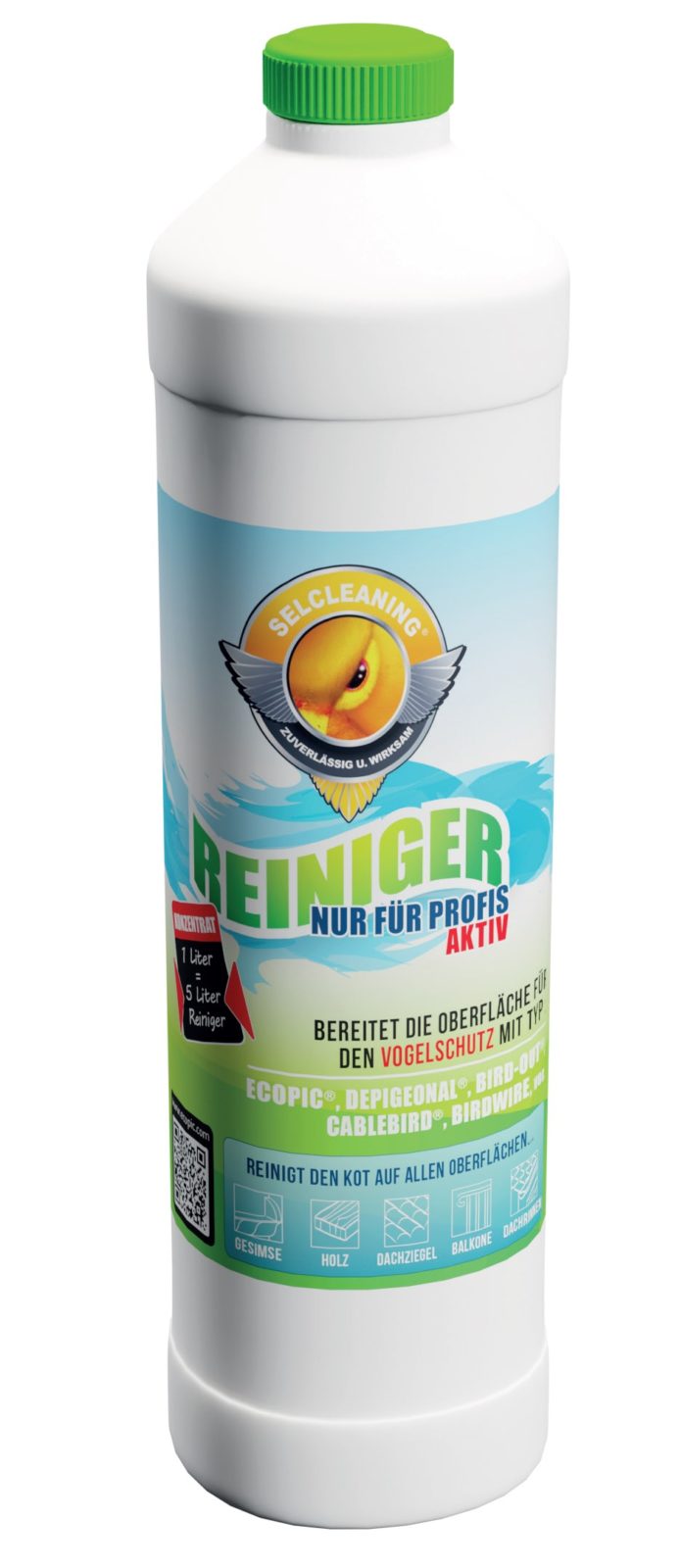 Aktiv-Reiniger für Profis. Bereitet die Oberfläche für den Taubenschutz mit dem Typ Ecopic®, Depigeonal®, BIRD-OUT®, Cable Bird®, Birdwire, vor. Reinigt alle Oberflächen wie Stein, Beton, Putz, Zink, usw. Nimmt Rücksicht auf die Anwender und die Umwelt. Unschädlich, weil keine chemischen Bestandteile enthalten sind.